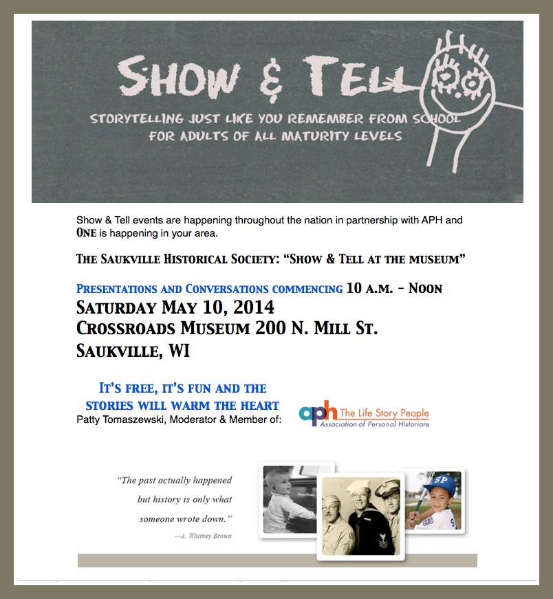 Show and Tell at the Museum Posted by Aaron Douglas on April 27, 2014 Posted in: Uncategorized. Tagged: events. Leave a comment Share this: Click to share on X (Opens in new window) X Click to share on Facebook (Opens in new window) Facebook Like Loading... Posts navigation ← Historic Walking Tour Spring 2014 Guided Autobiography Workshops →