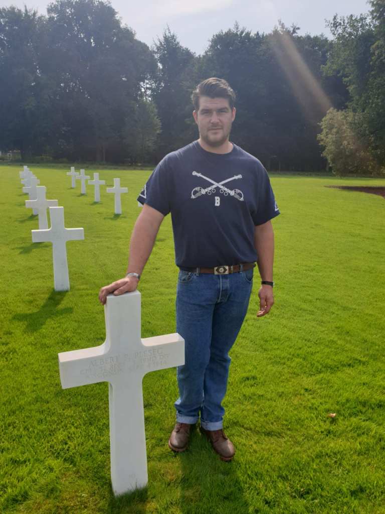 Sonny Ver, a member of Les jeunes du B40, who has researched Cpl. Albert P. Plesec and is working to raise funds for a memorial monument/plaque in Binche, Blegium, where Plesec died in WWII.