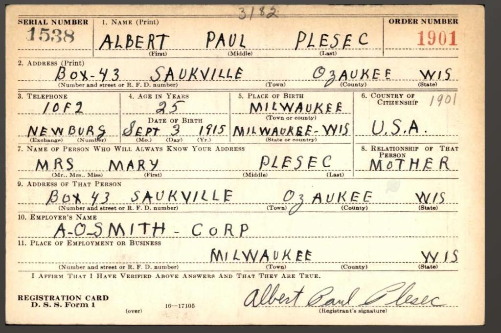 Albert was born September 3, 1915, in Milwaukee, Wisconsin. Son of an Austrian immigrant father who arrived in the USA on March 22, 1904, in New York and naturalized in 1932, and of a Yugoslavian immigrant mother. In the 1930’s, they lived in the small village of Saukville in Ozaukee County, Wisconsin (approximately 800 inhabitants). His siblings consisted of a brother, Frank, four years older than him, and a little sister, Vera, born in 1917. In 1937, his father Jacob was hit by a car and died there.